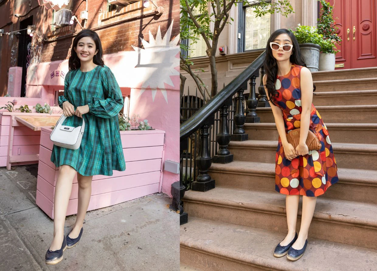 It's a sunny day out! While on vacation, of course, don't forget to wear sunglasses to protect your eyes from the hot sun. While visiting housing in New York City, Febby looked quirky and feminine wearing a dot party julia dress from the latest Kate Spade New York Fall 2022 collection. The eccentric polka-dot motif makes Febby's look more artsy, making it suitable for use when visiting museums while on vacation.